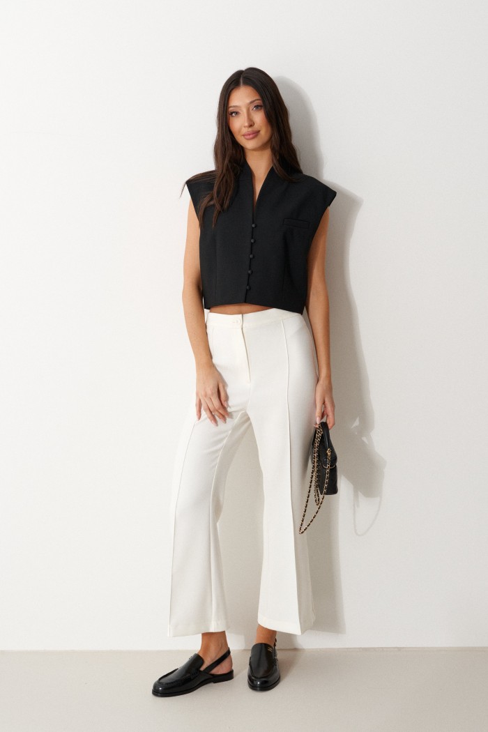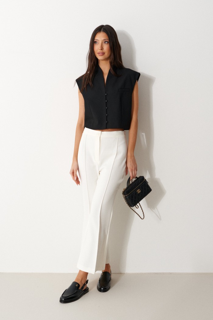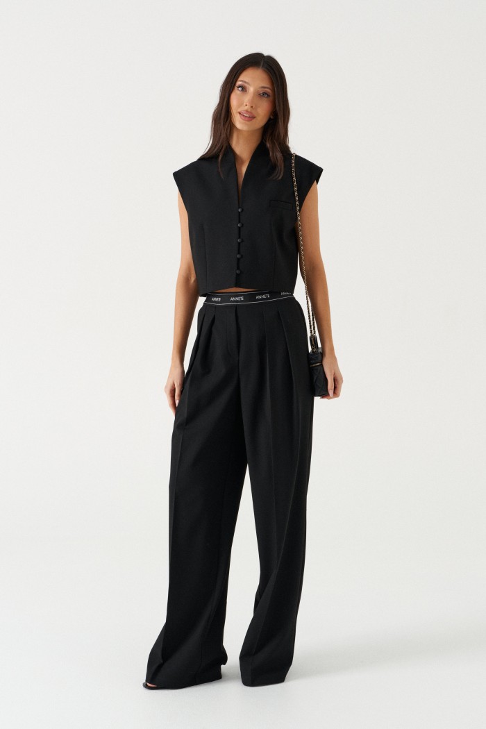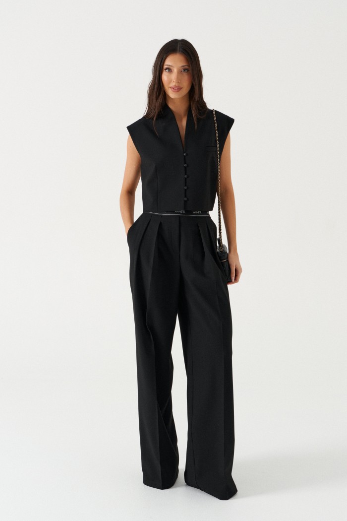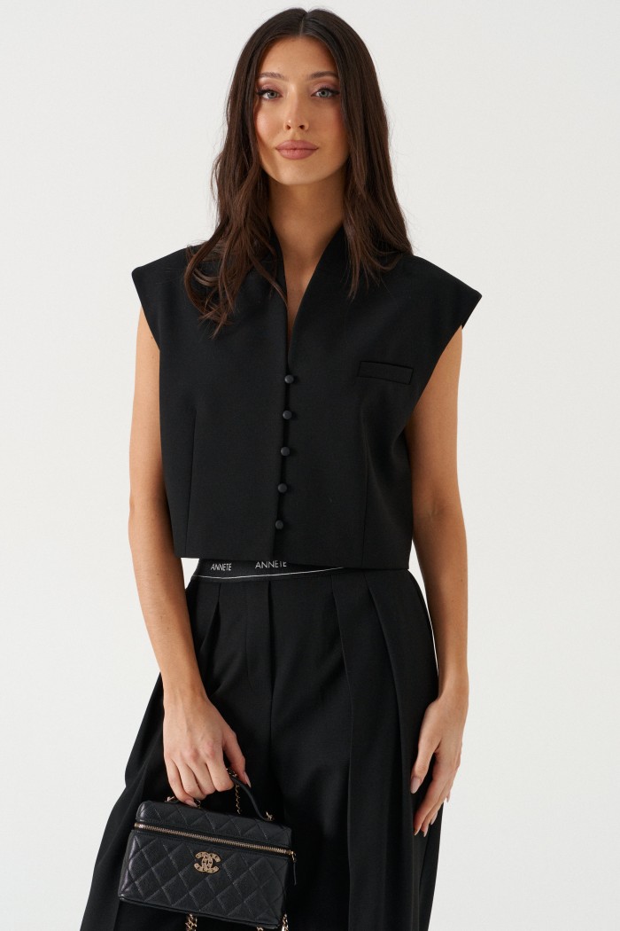 Жилет прямого свободного кроя выполнен из текстильного полотна черного цвета. Характеристики: прямой свободный крой,брендированная подкладка, застежки центральные на петли - пуговицы, декоративный карман. Длина по спинке 41см.