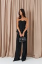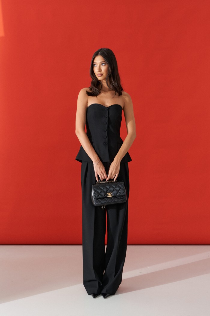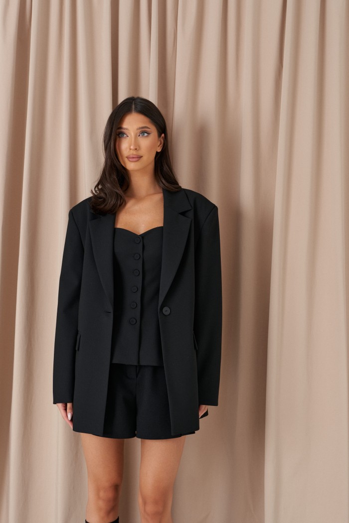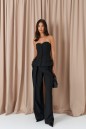 Жилет с открытыми плечами выполнен из костюмного полотна черного цвета.