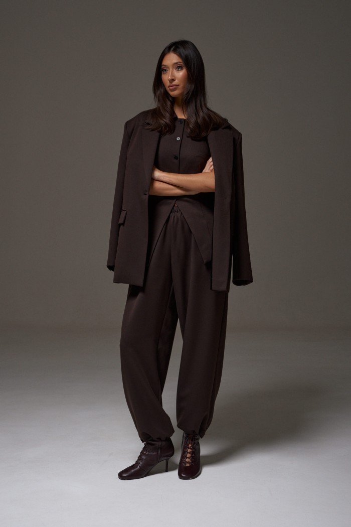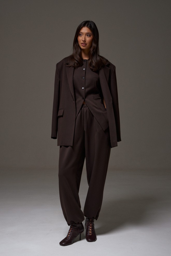 Жилет с открытыми плечами прилегающего силуэта выполнен из костюмной ткани шоколадного цвета. Характеристики: прилегающий силуэт, подкладка, застежка центральная на петли пуговички, отложной воротник, по переду изделия карманы. Длина по спинке 59 см.