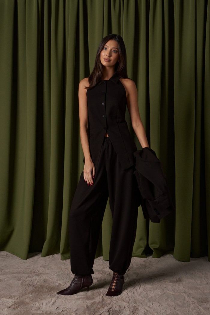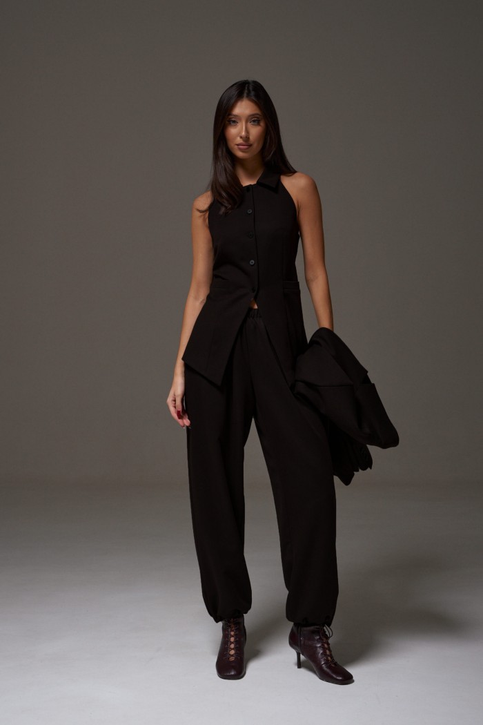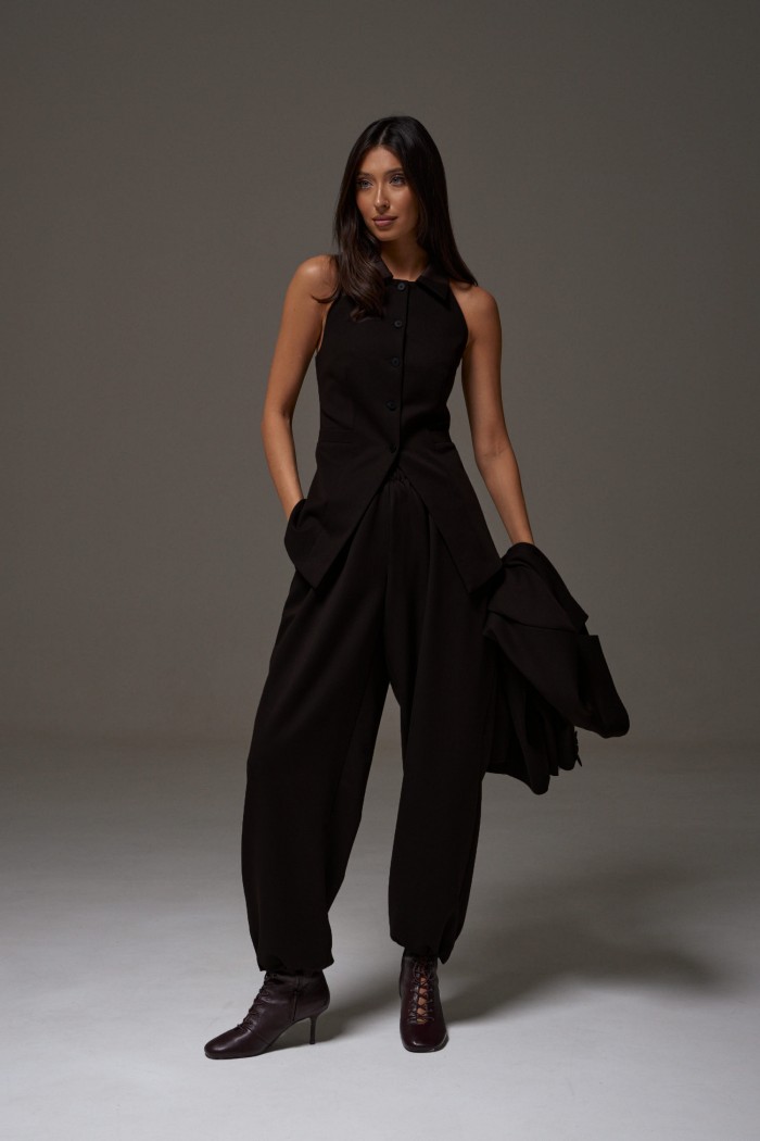 Жилет с открытыми плечами прилегающего силуэта выполнен из костюмной ткани черного цвета. Характеристики: прилегающий силуэт, подкладка, застежка центральная на петли пуговички, отложной воротник, по переду изделия карманы. Длина по спинке 59 см.