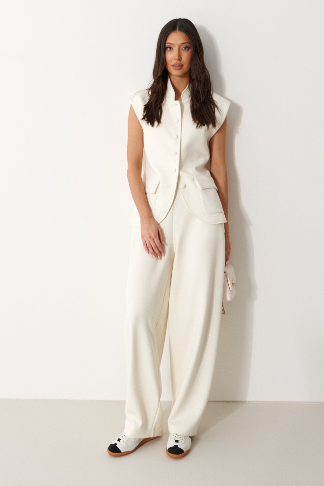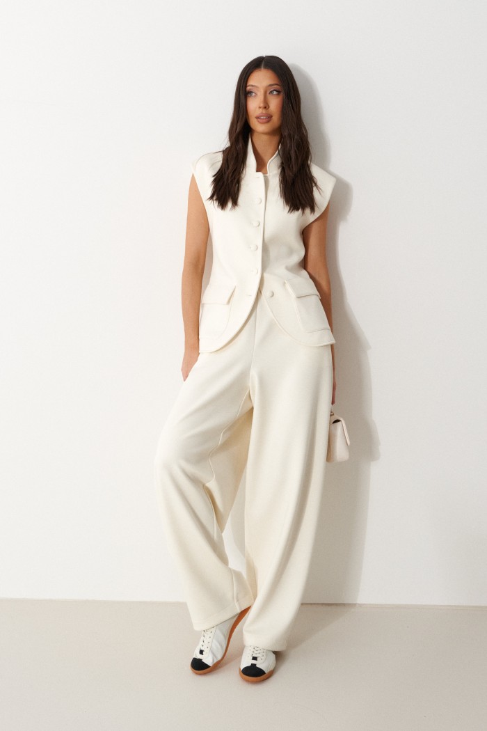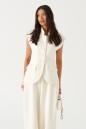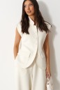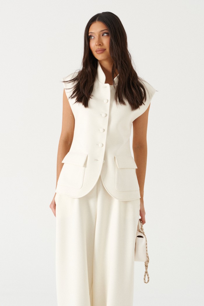 Жилет полуприталенного силуэта, выполнен из трикотажного полотна молочного цвета. Характеристики: полуприталенный силуэт, на подкладке, вырез горловины круглый с притачным воротником-стойкой, накоалные карманы с клапанами, спинка цельная, застежка центральная бортовая, застегивающаяся на пробивные петли и пришивные пуговицы. Длина изделия 62см.