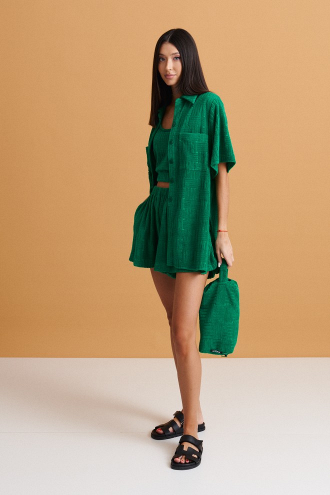 Рубашка прямого кроя выполнена из фактурного полотна насыщенного зеленого цвета.